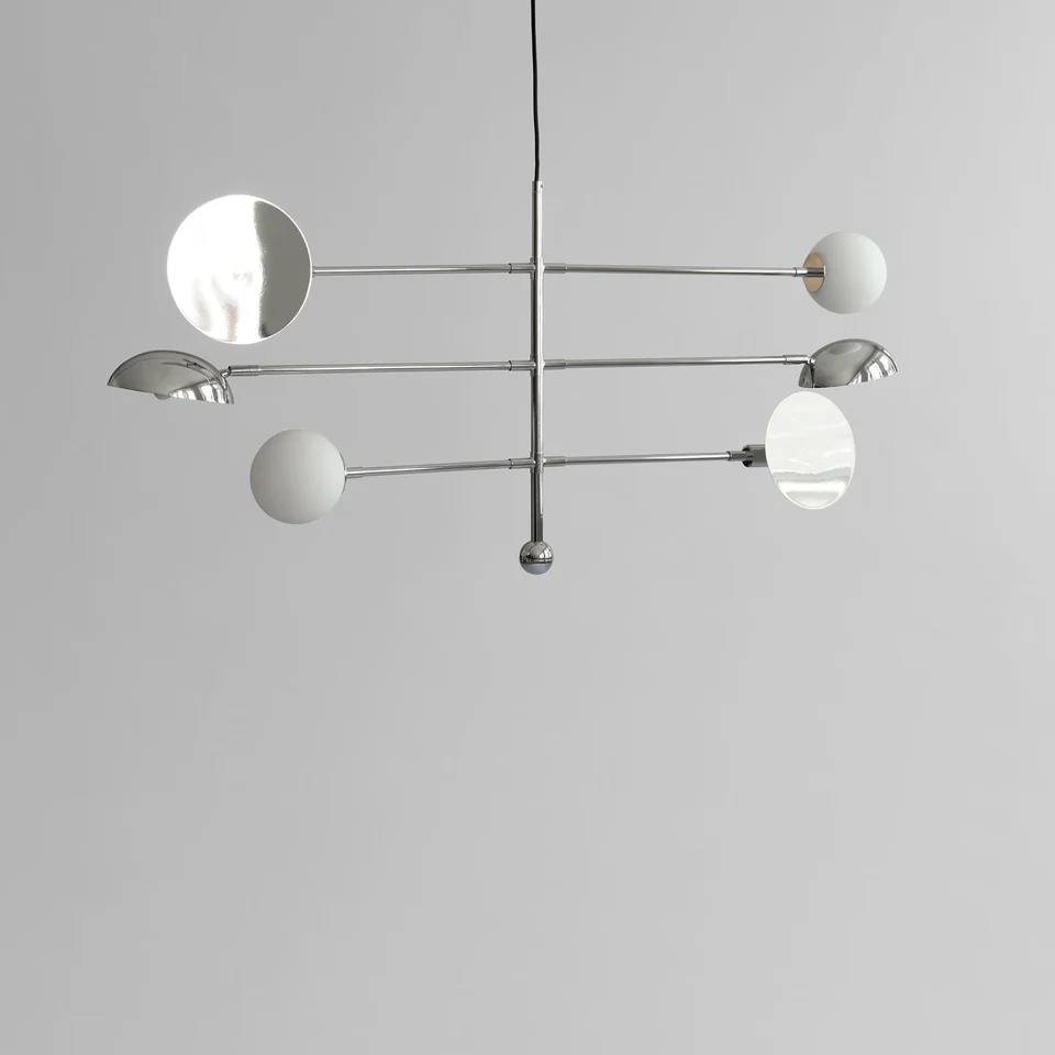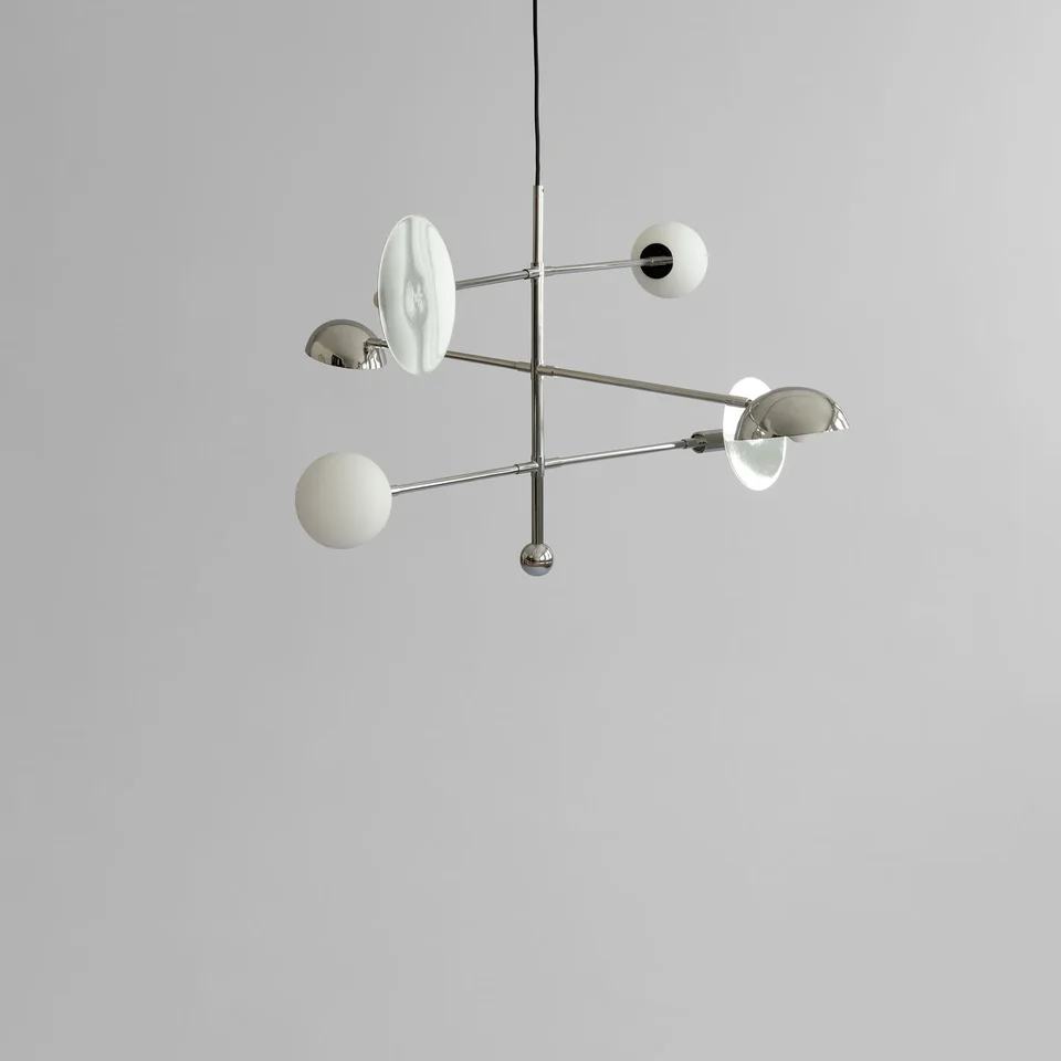 設計靈感來自 70 年代的未來主義與太空時代,強調動態與靈活性。每個燈臂和燈罩可以向不同方向旋轉與扭曲,呈現獨特且具雕塑感的光線效果,點亮整個空間。"Sahn" 是日語中 "三" 的意思,代表三個不同的燈罩,這些燈罩已經成為 101 Copenhagen 經典燈具設計的象徵。每個燈罩提供不同的光線體驗,為燈具增添了豐富且富有趣味的特色。