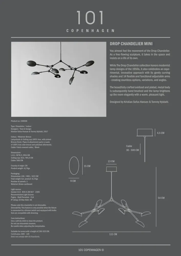 Drop吊燈彷彿帶有動感,以自由流動的雕塑形式融入空間,展現獨特的生命力。此系列致敬 1950 年代的現代主義燈飾設計,同時融合了大膽創新的設計手法,以14個可調節的靈活燈臂提供創新、多樣的照明選擇。