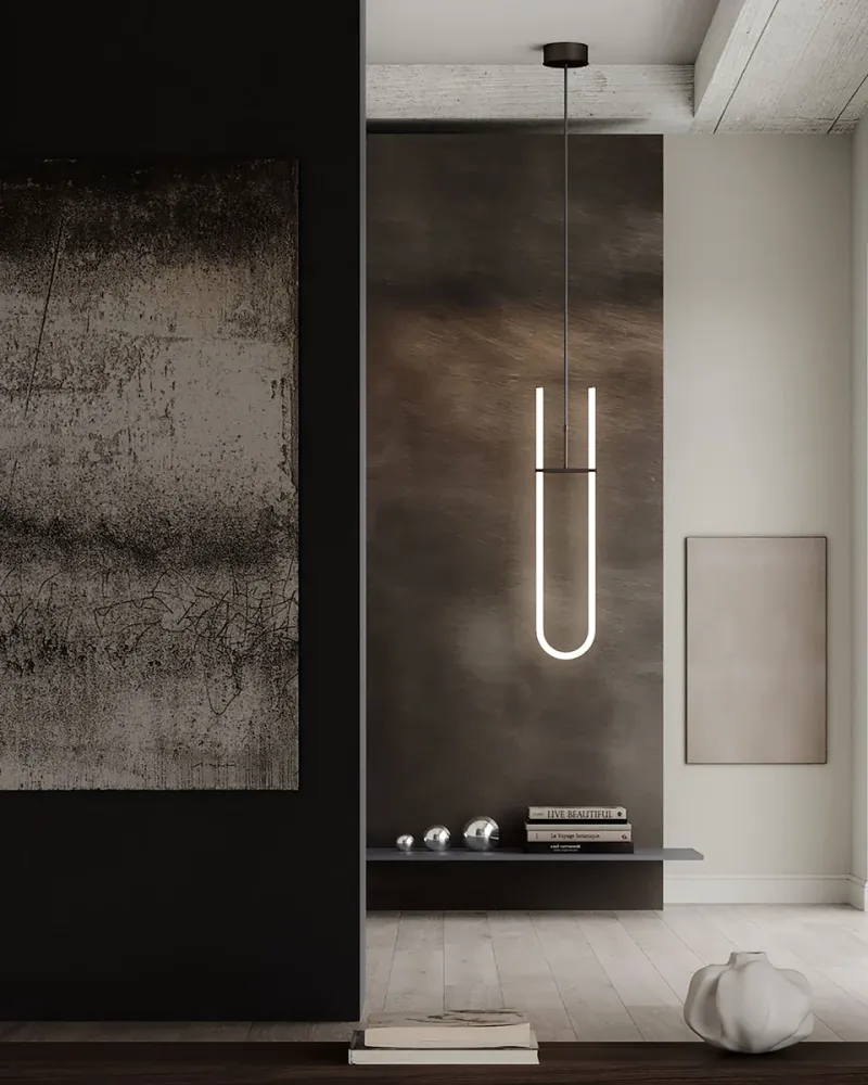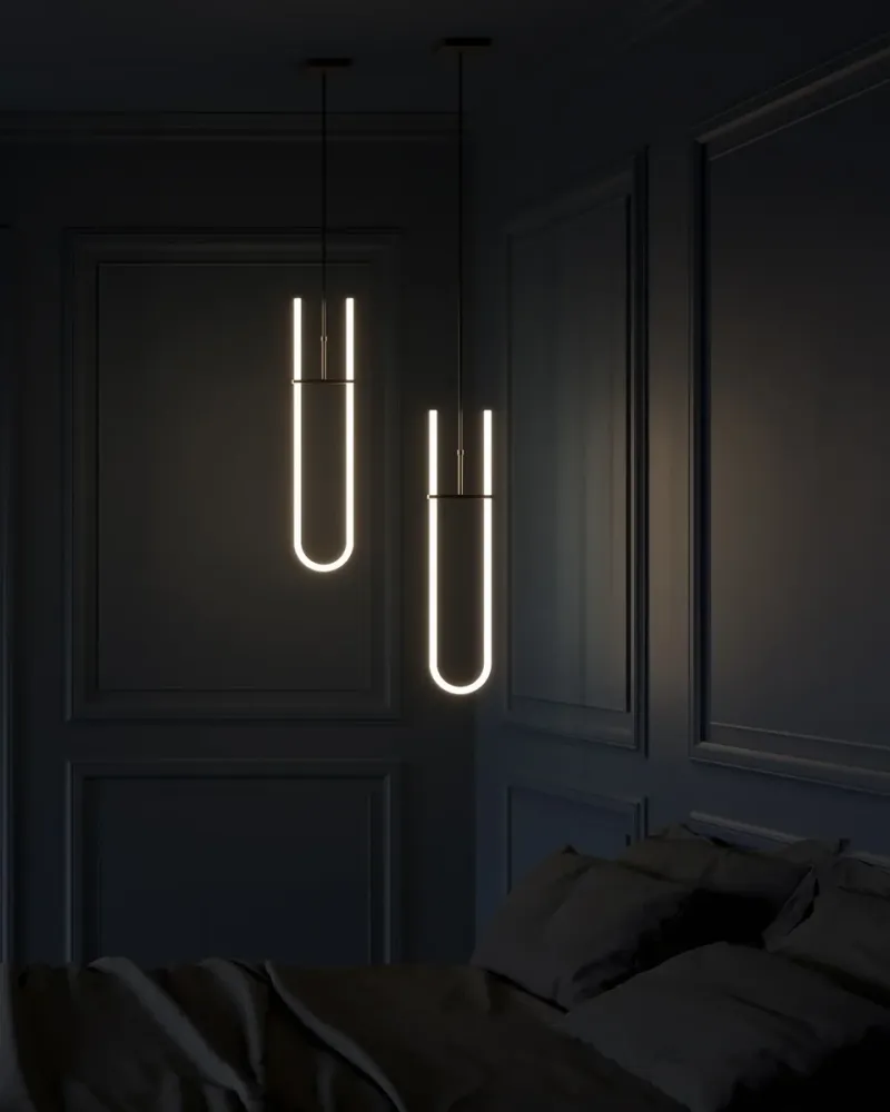 兩端由鍍金屬件裝飾,並安裝在幾何感十足的金屬支架上,燈散發出濃厚的圖形美感。不同於傳統霓虹燈的冷硬光線,這款創新吊燈散發著更柔和溫暖的光芒,營造出溫馨且舒適的氛圍。