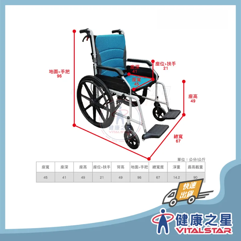 商品"頤辰" YC-615 可抬腳可摺背 輕量鋁合金輪椅 中輪 藍色