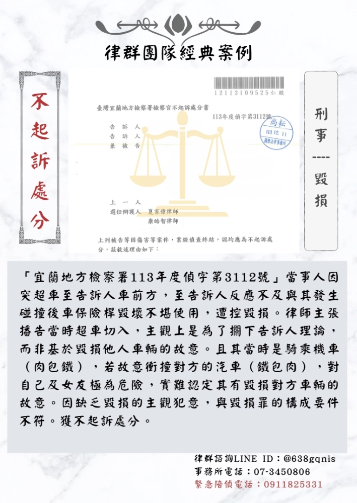 「宜蘭地方檢察署113年度偵字第3112號」當事人因突超車至告訴人車前方,至告訴人反應不及與其發生碰撞後車保險桿毀壞不堪使用,遭控毀損。律師主張播告當時超車切入,主觀上是為了攔下告訴人理論,而非基於毀損他人車輛的故意。且其當時是騎乘機車(肉包鐵),若故意衝撞對方的汽車(鐵包肉),對自己及女友極為危險,實難認定其有毀損對方車輛的故意。因缺乏毀損的主觀犯意,與毀損罪的構成要件不符。獲不起訴處分。