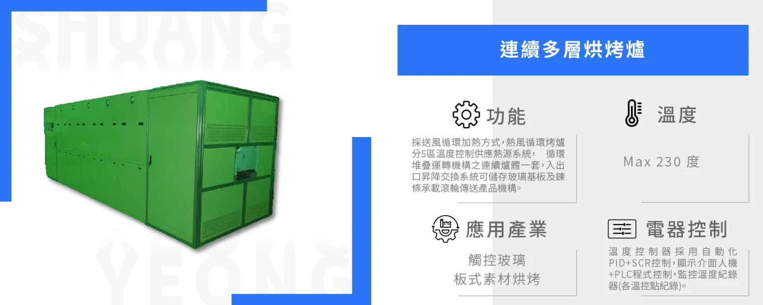(1) 功能 : 採送風循環加熱方式,熱風循環烤爐分5區溫度控制供應熱源系統,循環堆疊運轉機構之連續爐體一套,入出口昇降交換系統可儲存玻璃基板及鍊條承載滾輪傳送產品機構