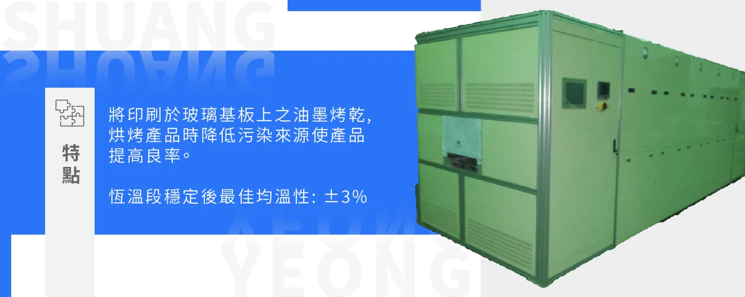 製程簡述:將印刷於玻璃基板上之油墨烤乾,烘烤產品時降低污染來源使產品提高良率