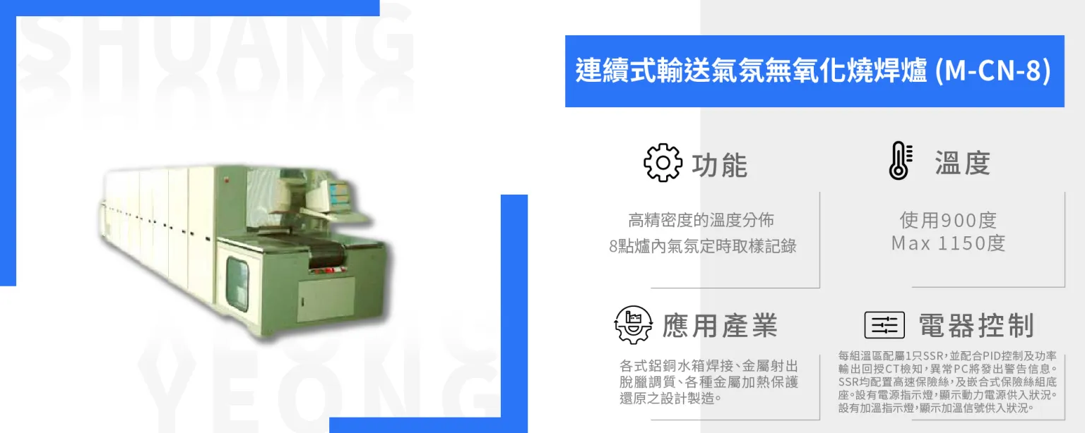應用產業: 鋁、不鏽鋼、銅製程退火、回火、調質、焊接。各式鋁銅水箱焊接、金屬射出脫臘調質、各種金屬加熱保護還原之設計製造。MLCC銅製程之燒附、半導體焊接