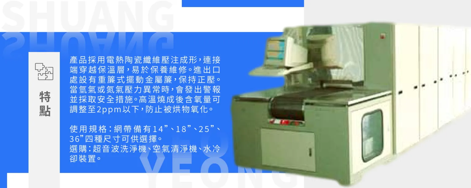 (4) 特點 : 電熱採陶瓷纖維嵌合壓注式一體成形,線材與陶瓷板緊密接合,導電連接端直接穿越保溫層,易於保養維修出入口處設置重簾式擺動金屬簾阻隔爐外之空氣進入及存蓄內膛之正壓,於氫氣進入檢測之氫氣入氣壓力,於壓力下限時發生警報,於氮氣進入檢測之氮氣入氣壓力,於壓力下限時發生警報,切斷氫氣入及加入大量氮氣進入爐膛,於氫氣外洩或濃度超過危險標準時傳送出警報接點及切斷氫氣氣源及入大量氮氣,以防止意外發生,利用火焰檢知系統以確保瓦斯點燃狀態,於必要時切斷氫氣氣源及入大量氮氣以防止火災意外發生,在高溫燒成后含氧量可調整側2ppm以下,防止被烘物氧化(視氮氣來源之純度)