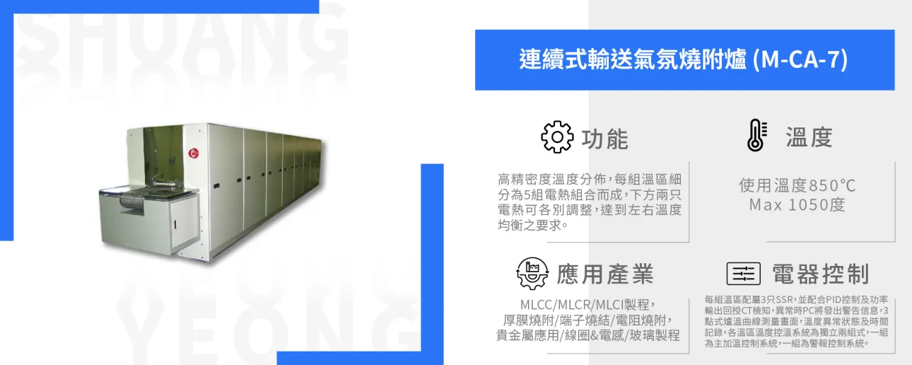 應用產業: MLCC/MLCR/MLCI製程。 厚膜燒附/端子燒結/電阻燒附。貴金屬應用/線圈&電感/玻璃製程