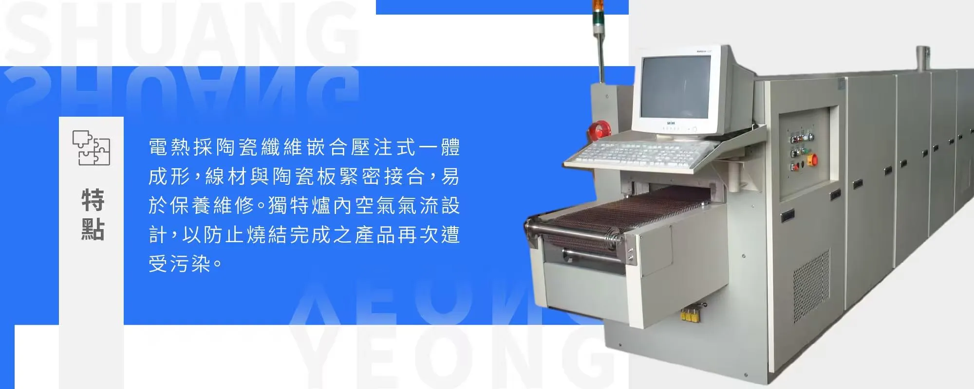 (4) 特點 : 電熱採陶瓷纖維嵌合壓注式一體成形,線材與陶瓷板緊密接合,易於保養維修,獨特爐內空氣氣流設計,以防止燒結完成之產品再次遭受污染