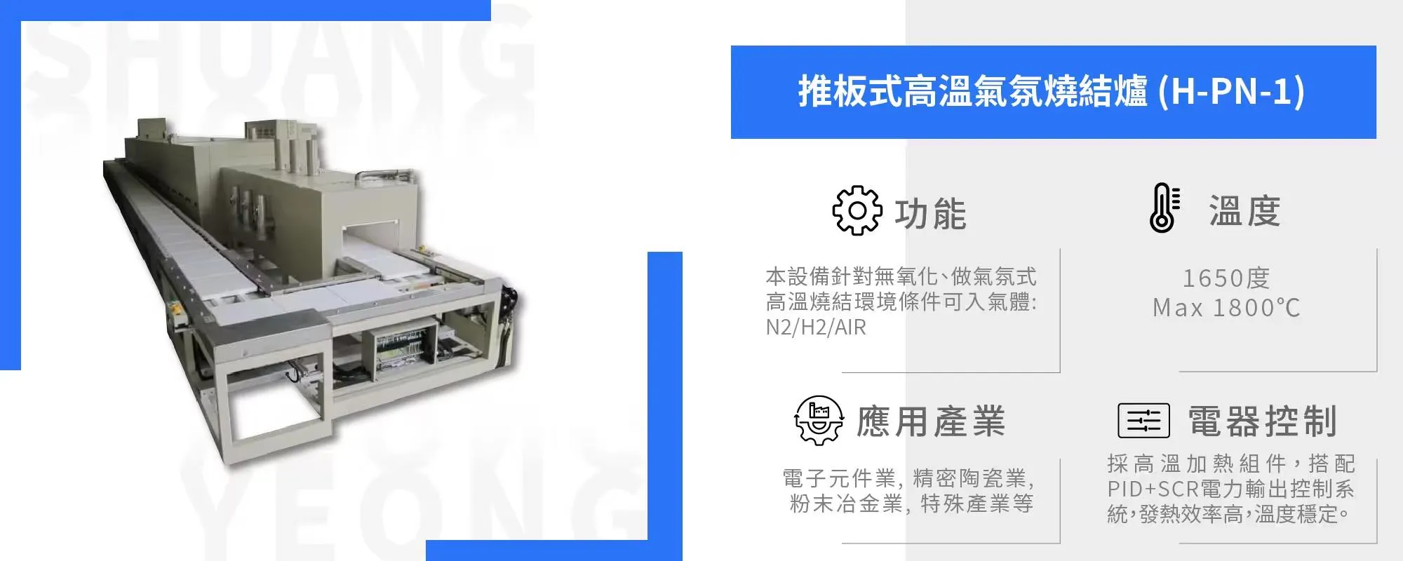 (1) 功能 : 本設備針對無氧化、做氣氛式高溫燒結環境條件,可入氣體: N2/H2/AIR