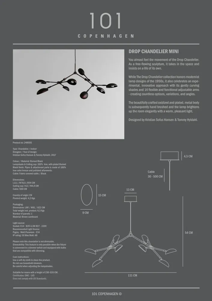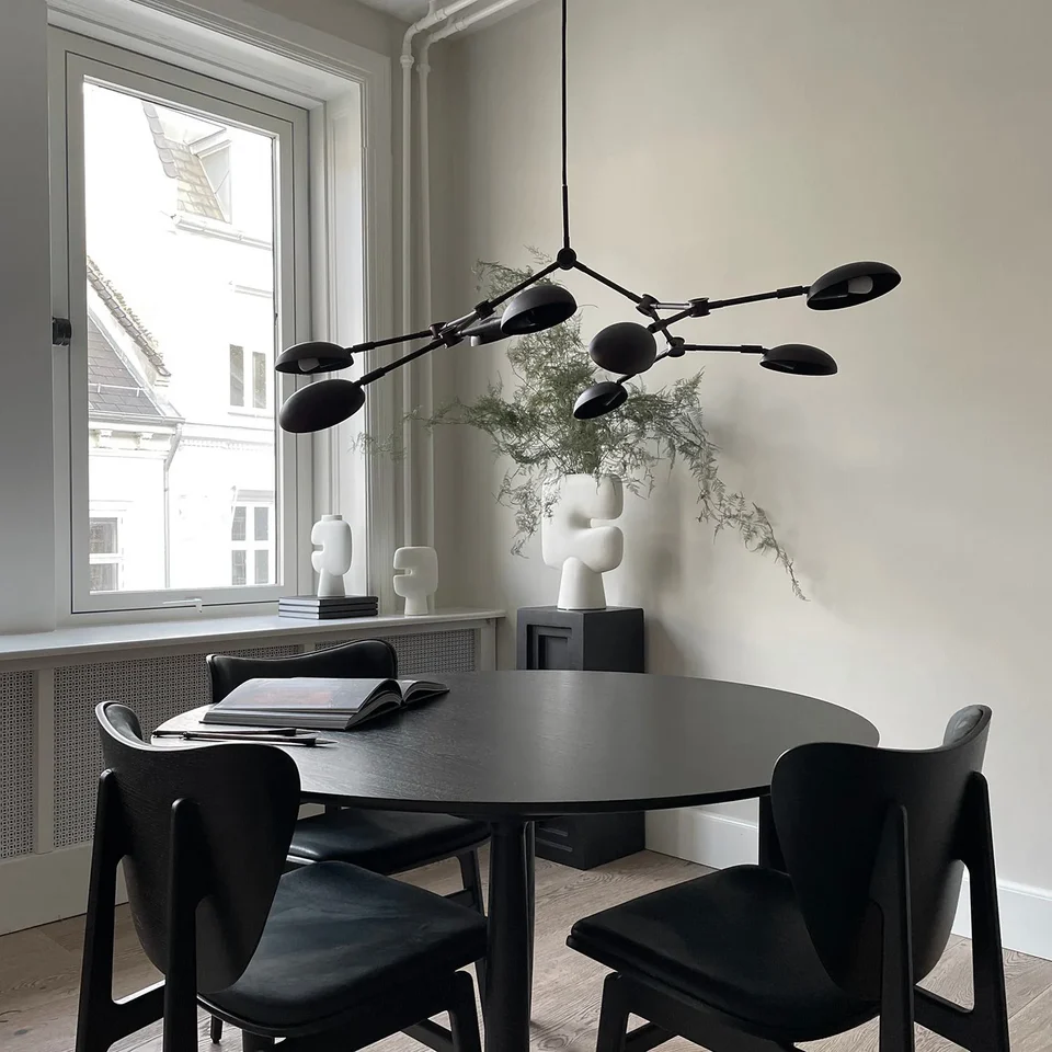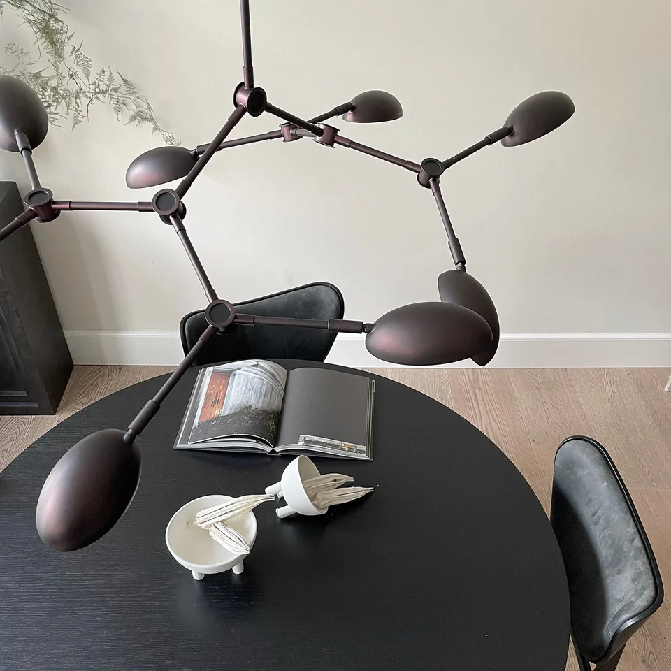 Drop吊燈彷彿帶有動感,以自由流動的雕塑形式融入空間,展現獨特的生命力。此系列致敬 1950 年代的現代主義燈飾設計,同時融合了大膽創新的設計手法,以14個可調節的靈活燈臂提供創新、多樣的照明選擇。燈體採用精緻的燒黑金屬製成,經手工細緻拋光,燈光柔和溫暖,為空間帶來優雅氛圍。