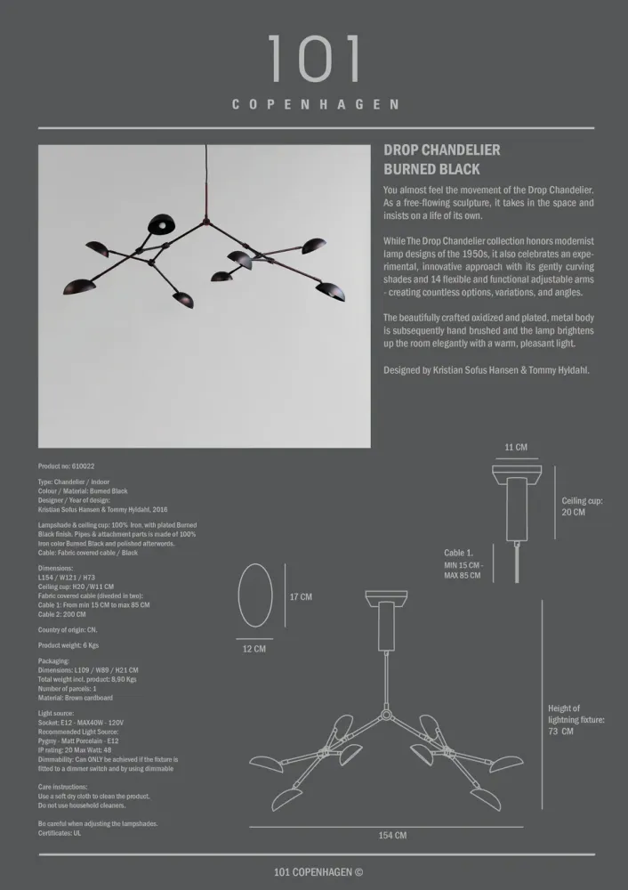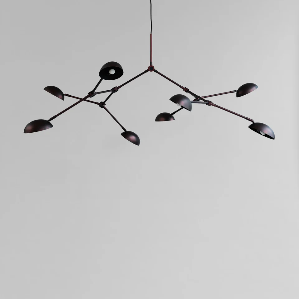 Drop吊燈彷彿帶有動感,以自由流動的雕塑形式融入空間,展現獨特的生命力。此系列致敬 1950 年代的現代主義燈飾設計,同時融合了大膽創新的設計手法,以14個可調節的靈活燈臂提供創新、多樣的照明選擇。燈體由燒黑處理與電鍍金屬精製而成,並經過手工拋光處理,整體設計優雅且充滿質感,釋放出溫暖而舒適的光芒,為空間增添獨特氛圍。