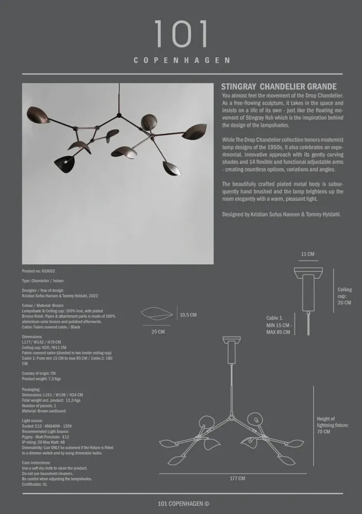 靈感來自魟魚,燈罩融合了柔和形狀與鋒利線條的對比。這個幾乎懸浮的燈罩是Stingray系列的核心,優雅地呈現在兩款枝形吊燈、一款桌燈和一款落地燈中。燈罩的設計使燈光源根據觀察角度而隱藏或顯現,創造出靈活且富有藝術感的光影體驗。