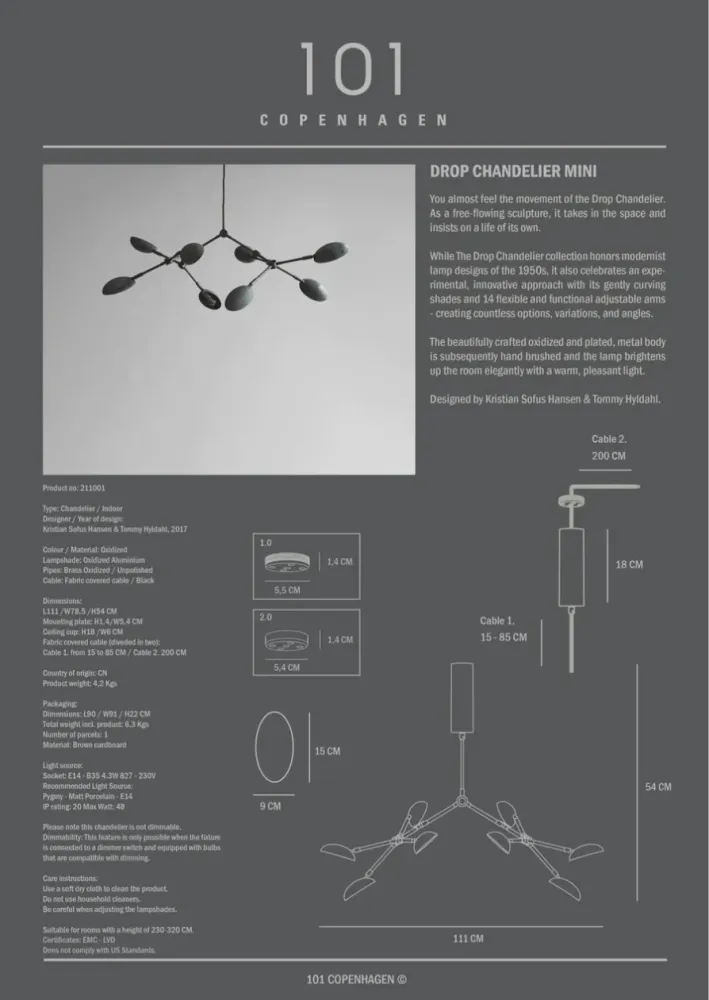 Drop吊燈彷彿帶有動感,以自由流動的雕塑形式融入空間,展現獨特的生命力。此系列致敬 1950 年代的現代主義燈飾設計,同時融合了大膽創新的設計手法,以14個可調節的靈活燈臂提供創新、多樣的照明選擇。