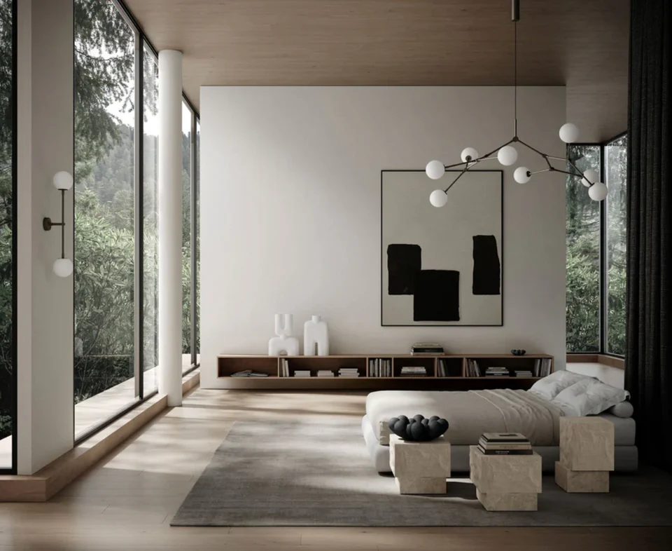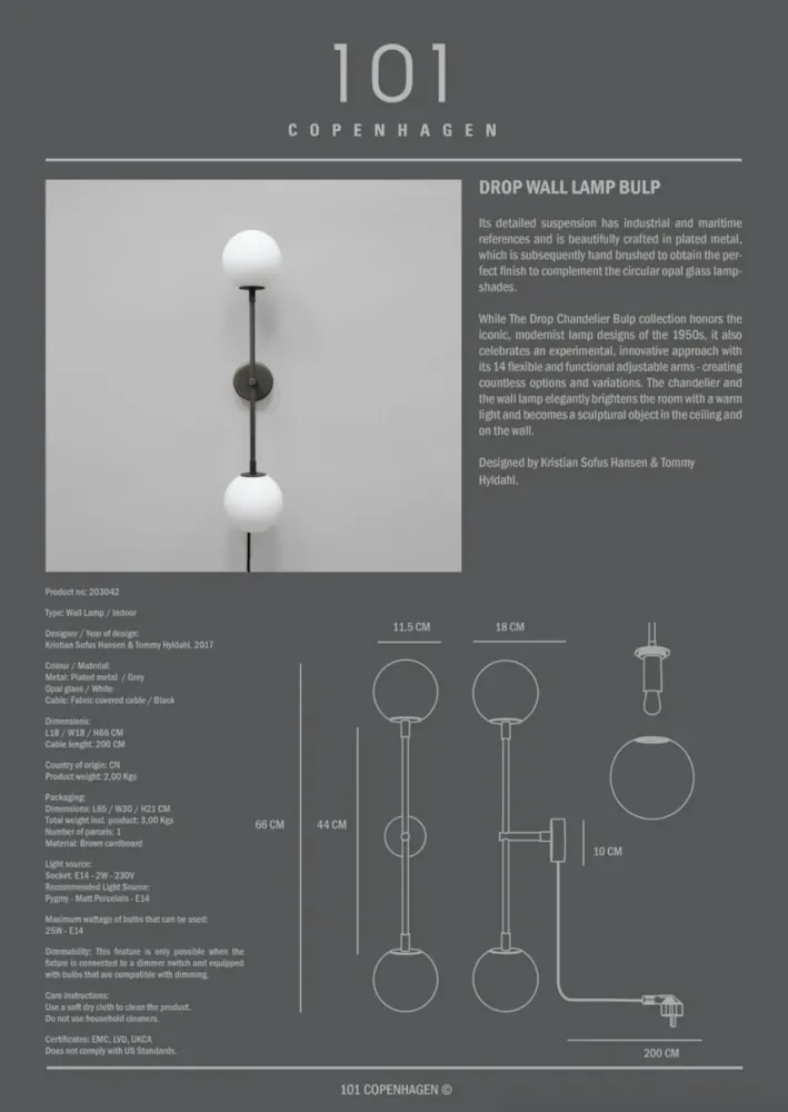 該燈的特點是與 Chandelier 相同的照明裝置和圓形乳白色玻璃燈罩。 吊燈優雅地照亮了房間,成為牆上的雕塑作品。