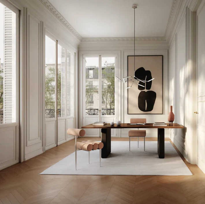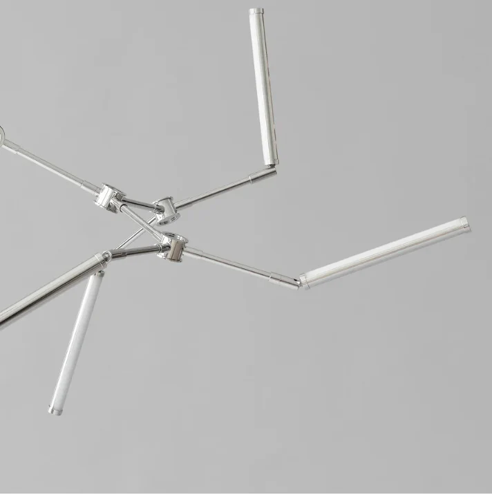 Stick Chandelier 提供兩種尺寸,以及溫潤拉絲古銅與鏡面鉻兩款精緻表面處理。無論懸掛於餐廳上方,或作為開闊大廳的視覺焦點,都能為空間帶來雕塑存在感、暖光氛圍與永恆的簡潔美學。