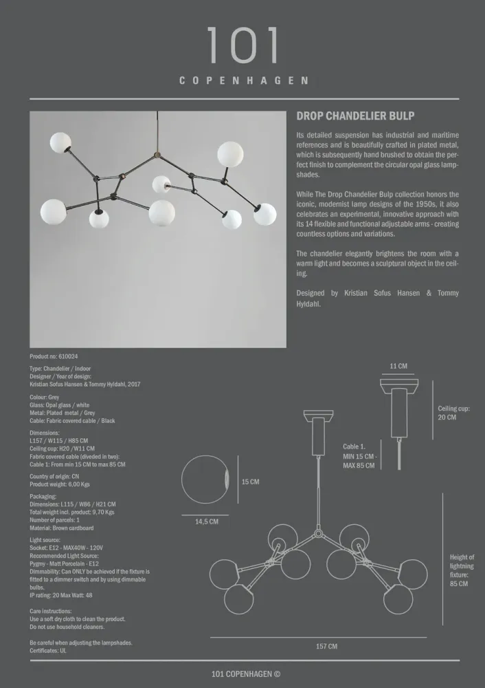 Drop吊燈彷彿帶有動感,以自由流動的雕塑形式融入空間,展現獨特的生命力。此系列致敬 1950 年代的現代主義燈飾設計,同時融合了大膽創新的設計手法,以14個可調節的靈活燈臂提供創新、多樣的照明選擇。