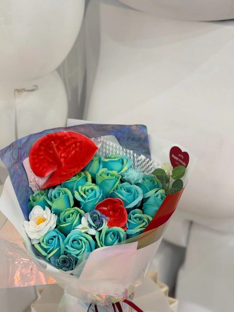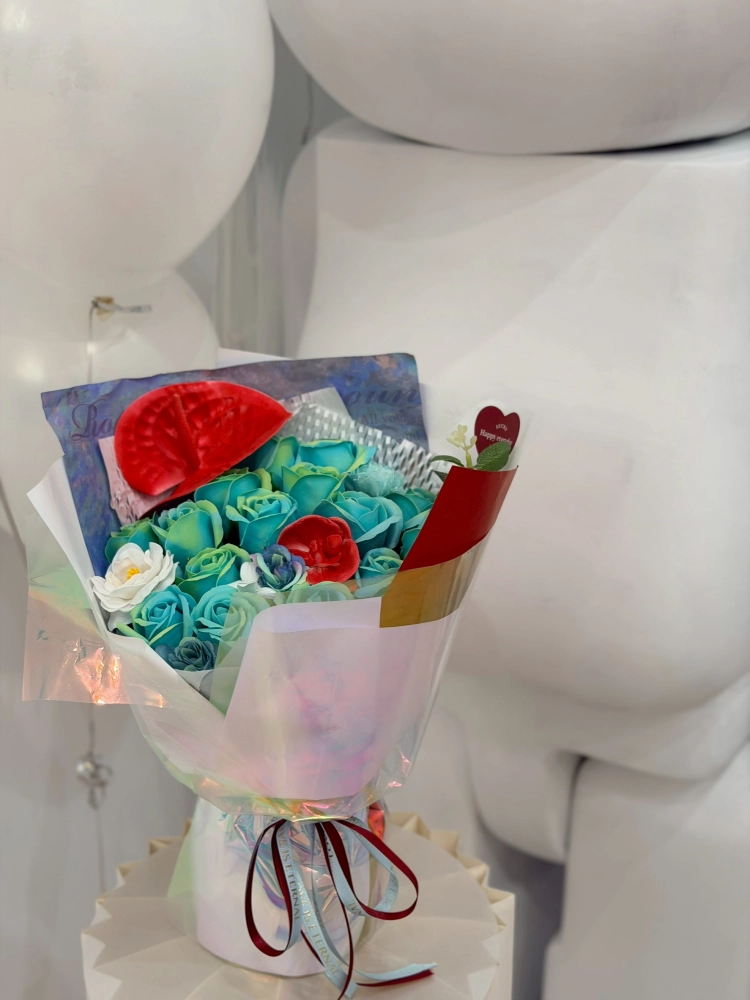 青玫如少年眼底的憂鬱,紅掌似少女唇畔的熱烈,白瓣是未說出口的純真,幻彩紙是愛情裡的萬種風情。