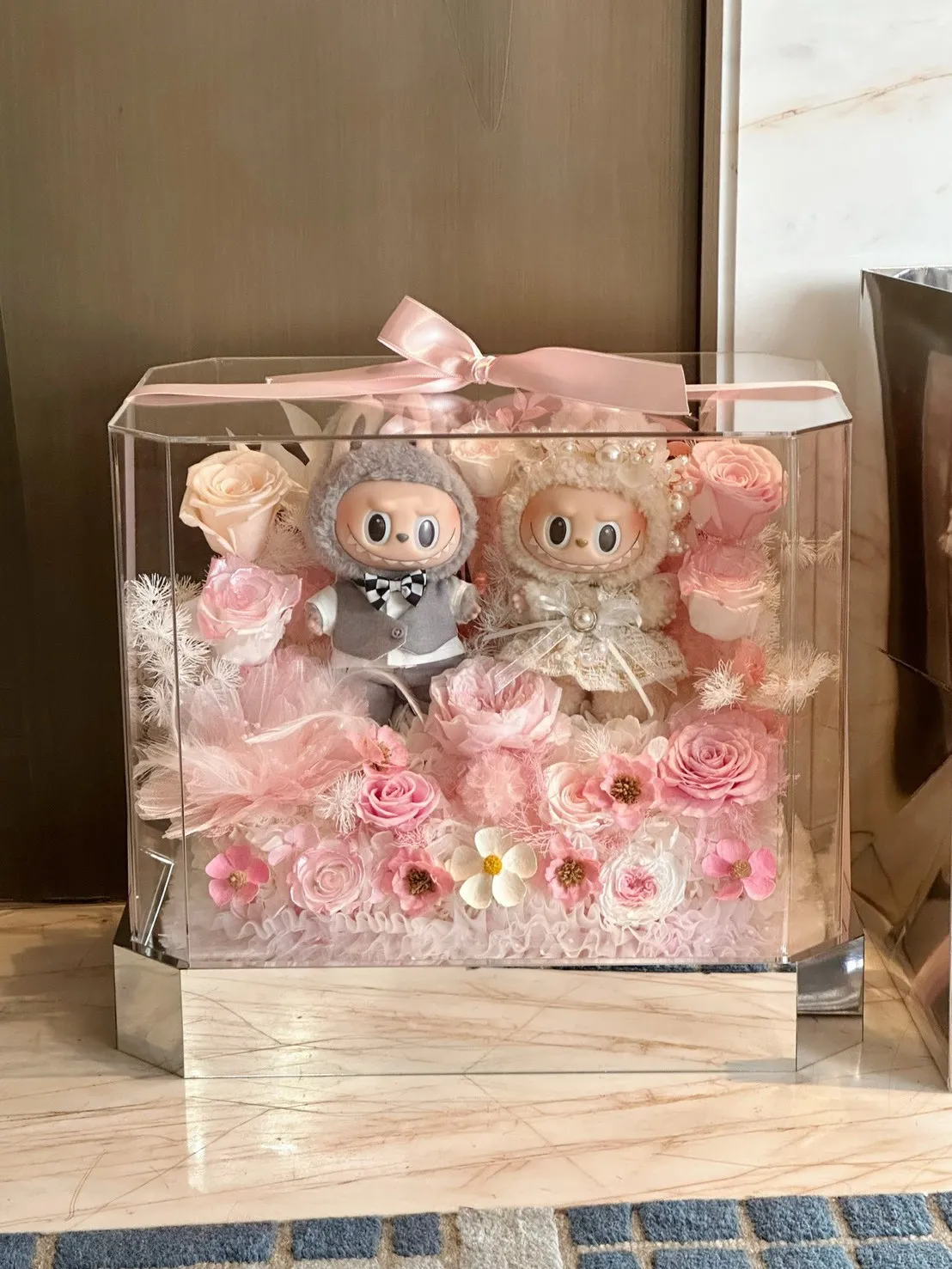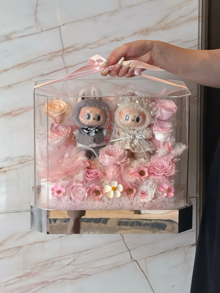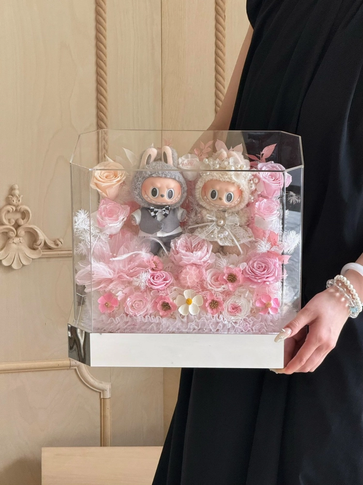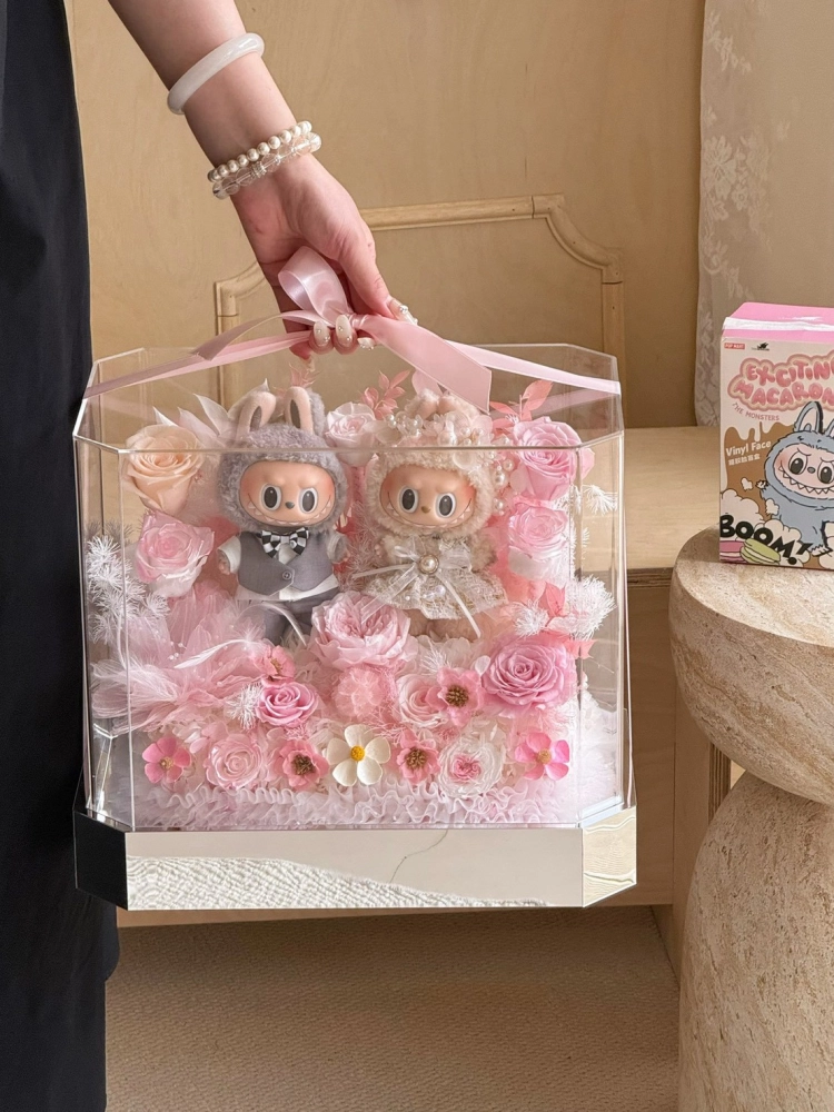 一盒永不凋謝的浪漫,當玩偶遇見花藝,連空氣都變成了粉紅色,今天,讓愛住進花園裡。