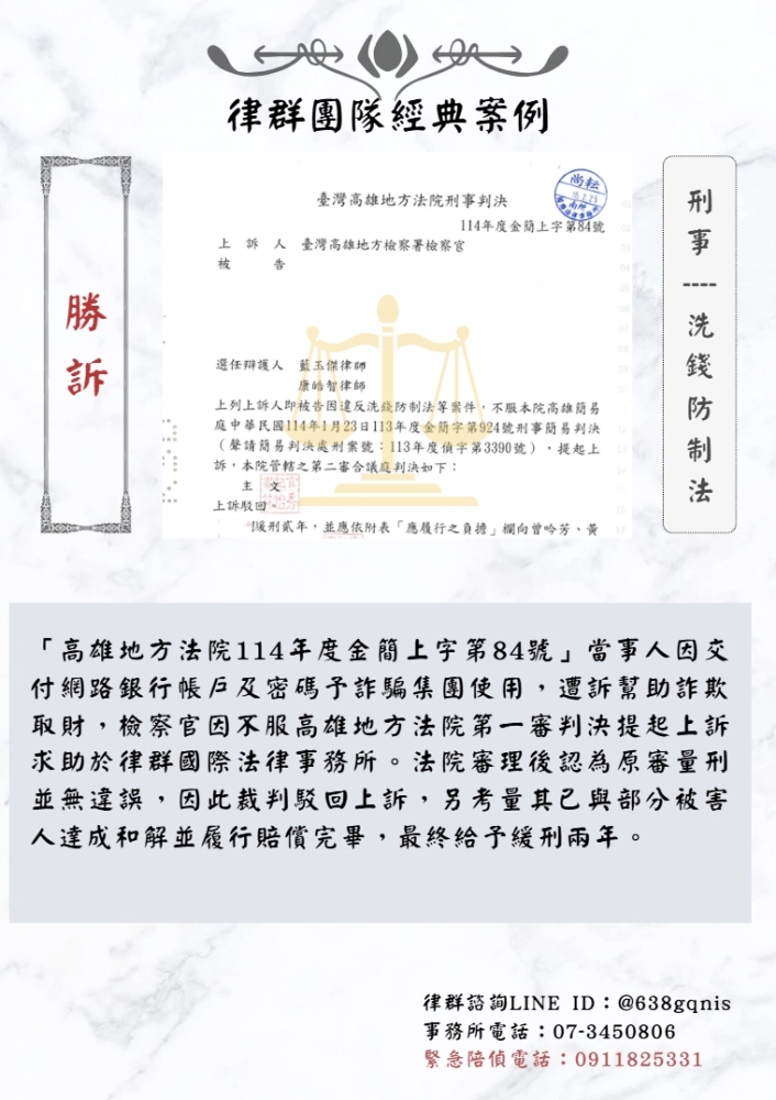 「高雄地方法院114年度金簡上字第84號」當事人因交付網路銀行帳戶及密碼予詐騙集團使用,遭訴幫助詐欺取財,檢察官因不服高雄地方法院第一審判決提起上訴求助於律群國際法律事務所。法院審理後認為原審量刑並無違誤,因此裁判駁回上訴,另考量其已與部分被害人達成和解並履行賠償完畢,最終給予緩刑兩年。