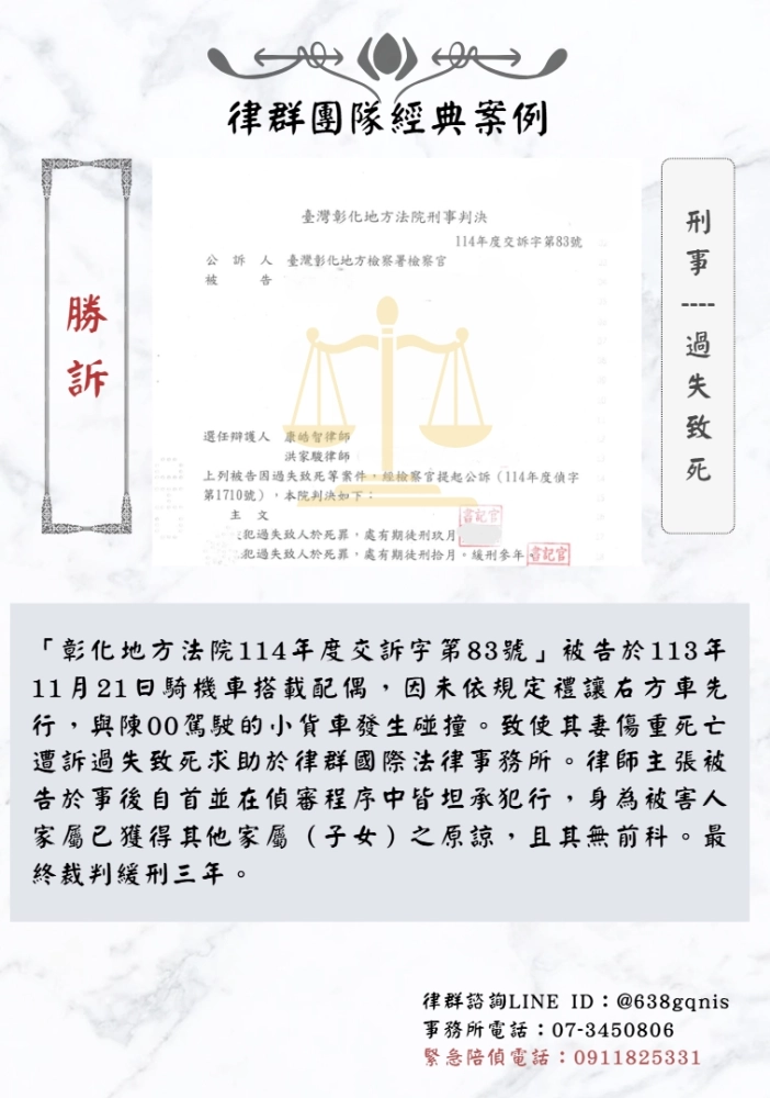 「彰化地方法院114年度交訴字第83號」被告於113年11月21日騎機車搭載配偶,因未依規定禮讓右方車先行,與陳00駕駛的小貨車發生碰撞。致使其妻傷重死亡遭訴過失致死求助於律群國際法律事務所。律師主張被告於事後自首並在偵審程序中皆坦承犯行,身為被害人家屬已獲得其他家屬(子女)之原諒,且其無前科。最終裁判緩刑三年。
