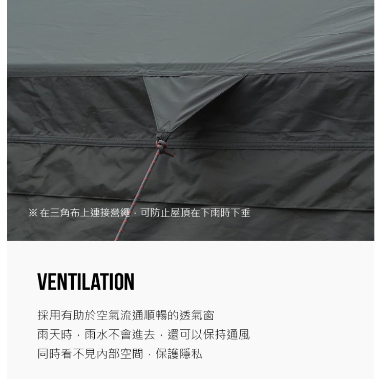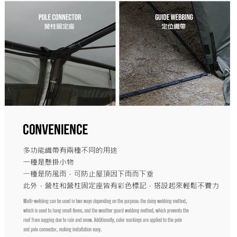 🔹多功能織帶有兩種不同的用途:一種是懸掛小物,一種是防風雨,可防止屋頂因下雨而下垂