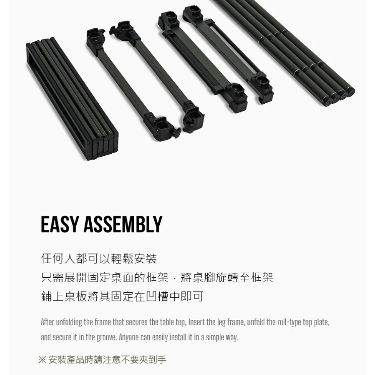 🔹只需展開固定桌面的框架,將桌腳旋轉至框架,鋪上桌板將其固在凹槽中即可