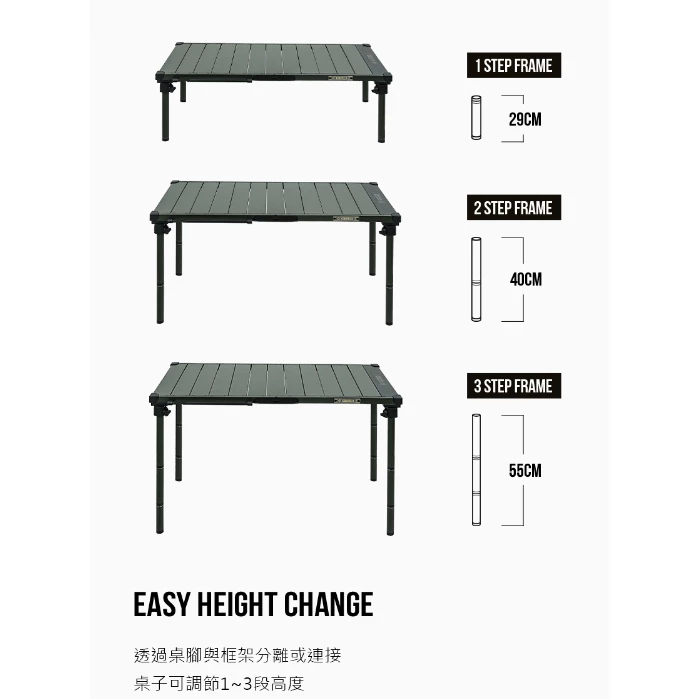 🔹透過桌腳與框架分離或連接,桌子可調節29/40/55公分高度