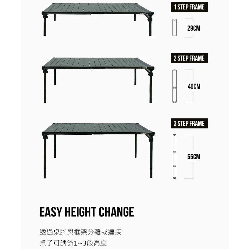 🔹透過桌腳與框架分離或連接,桌子可調節29/40/55公分高度