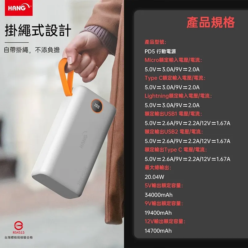 黑-PD5 HANG 65000 PD+QC 認證行動電源