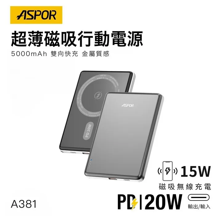• ASPOR 5000金屬超薄磁吸行動電源A381-寶