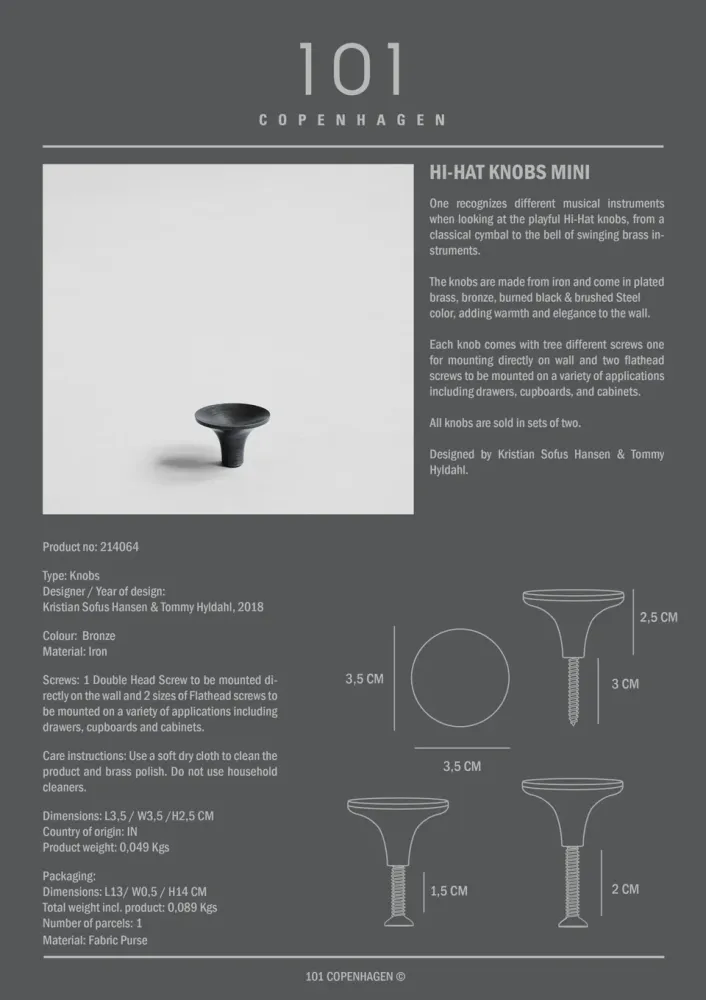 旋鈕由鐵製成,有鍍黃銅、燒黑、拉絲鋼或鍍青銅的表面處理,為空間增添溫暖和優雅。