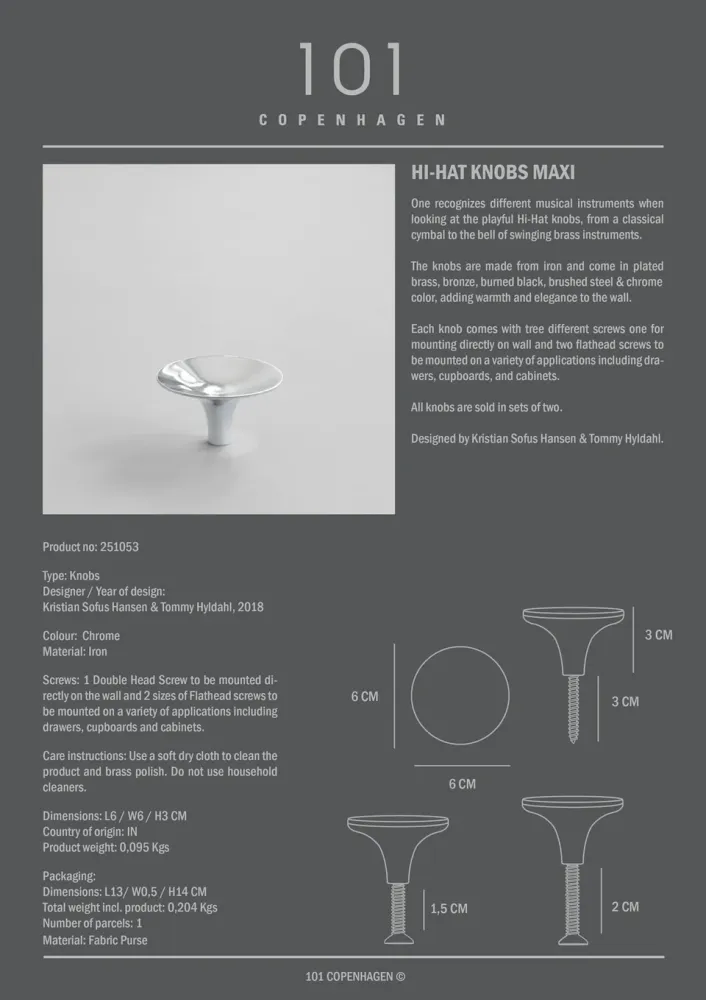 旋鈕採用耐用的鐵材質製成,提供多種精緻表面處理選擇,包括鍍黃銅、燒黑、拉絲鋼、鍍青銅,以及全新推出的鉻色,為空間增添溫暖、優雅與現代感。無論安裝於牆面、廚房或家具上,這些旋鈕都能完美結合藝術與實用性。