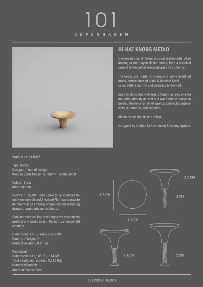 Hi-Hat 旋鈕的設計靈感來自各種樂器,形似古典的鈸和銅管樂器的鈴鐺。當人們看到俏皮的旋鈕時,就會認出各種樂器,從古典鐃鈸到擺動銅管樂器的鈴聲。