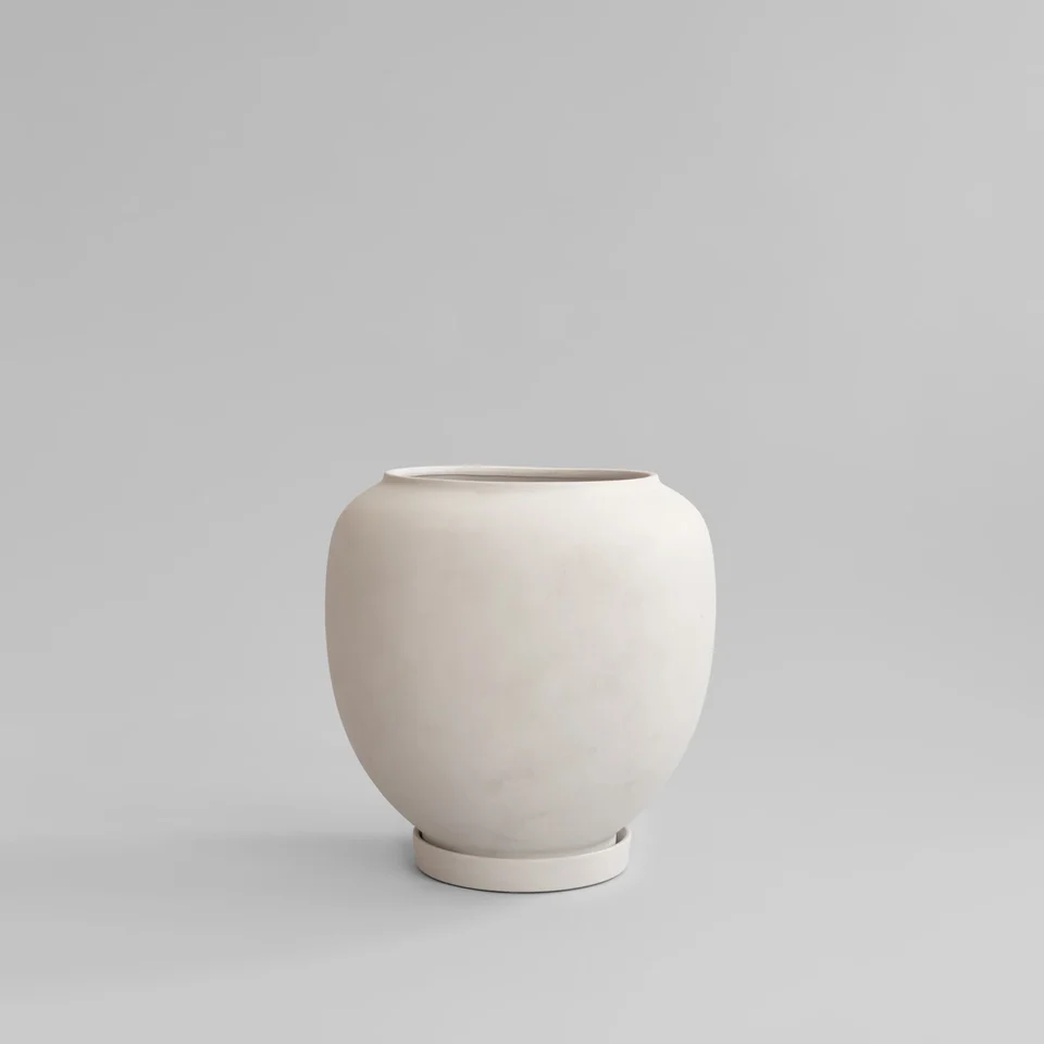 植栽盆以陶瓷製成,適用於室內與戶外空間。設計上貼心配置排水孔與相同款式的托盤,有助於維持植物所需的良好排水與空氣流通,同時保有沉靜而具雕塑感的外觀。