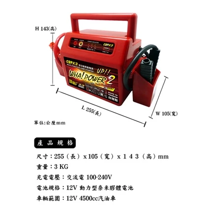 👍瞬間可輸出400A電流,可輕易啟動4500cc以下汽油車或機車、2000CC以下柴油車