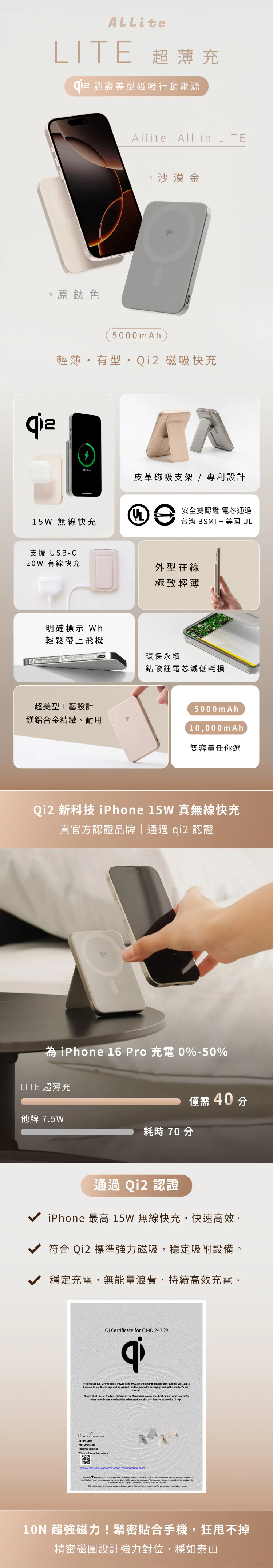 Allite LITE 超薄充 5000 mAh Qi2 磁吸支架行動電源( 產品標示 Wh,可帶上飛機 )