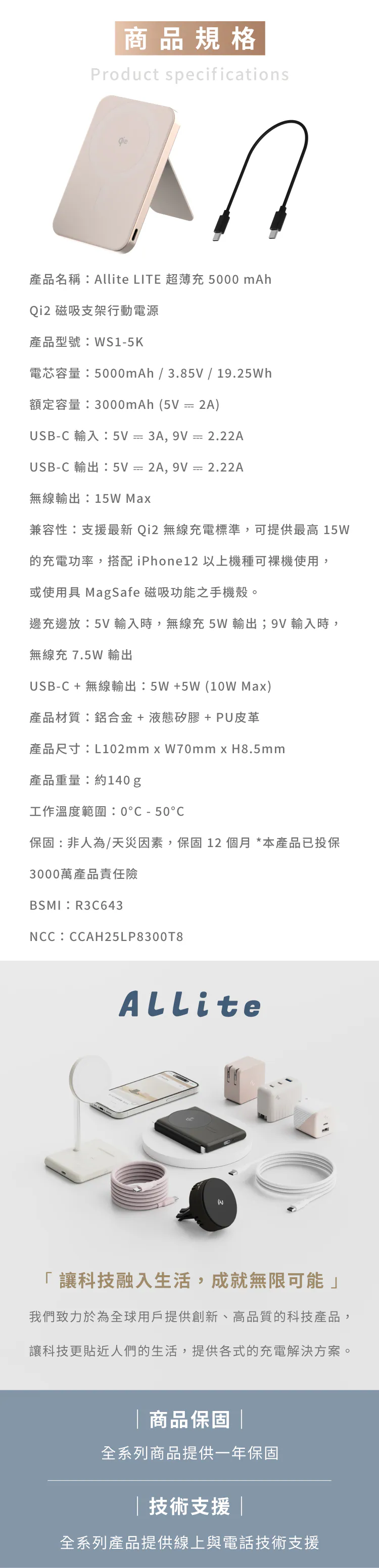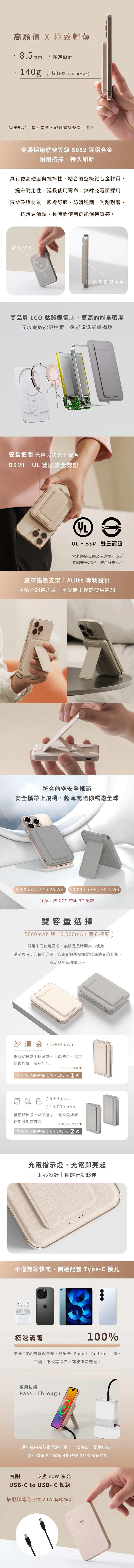 • Allite 5000mAh Qi2 超薄磁吸支架行動電源