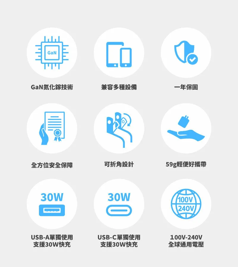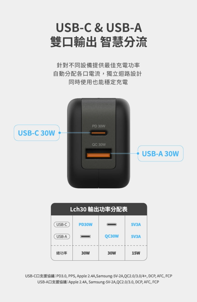 ·採用GaN氮化鎵最新第三代半導體科技,30W高功率迷你充電器 ·適用100V-240V國際通用電壓,支援PD3.0/ QC2.0/ QC3.0/ QC4.0/ PPS/ DCP/ AFC/ FCP/ Apple 2.4A/ Samsung 5V⎓2A 等快速充電協議 ·雙口輸出可以智能調節輸出功率,針對不同設備提供最佳充電功率