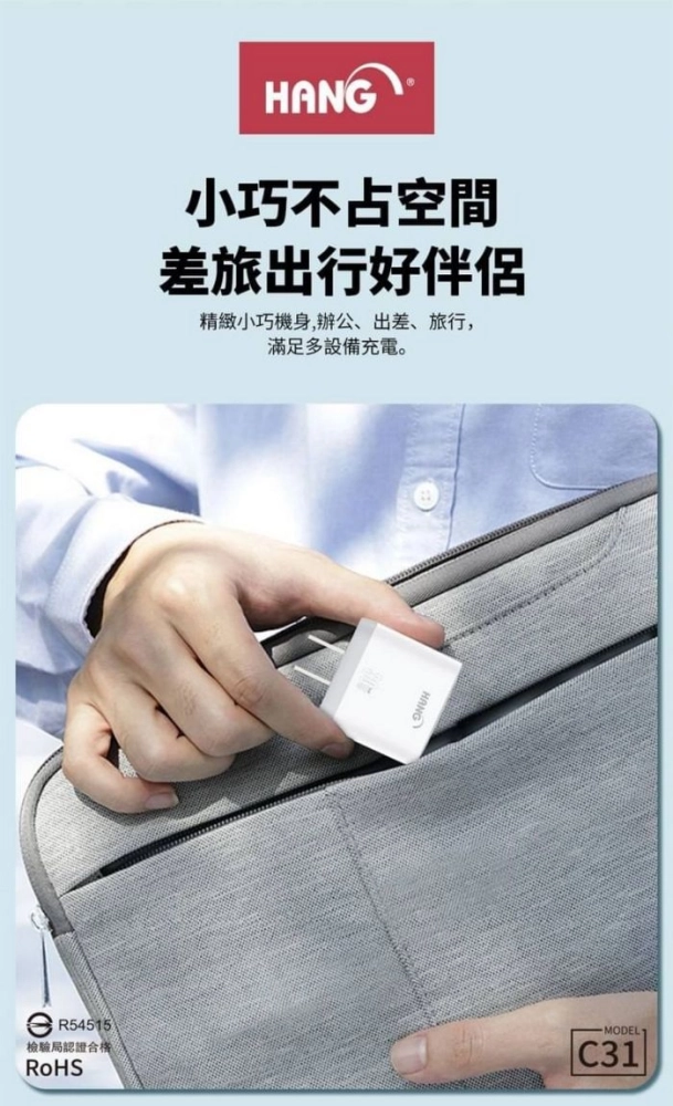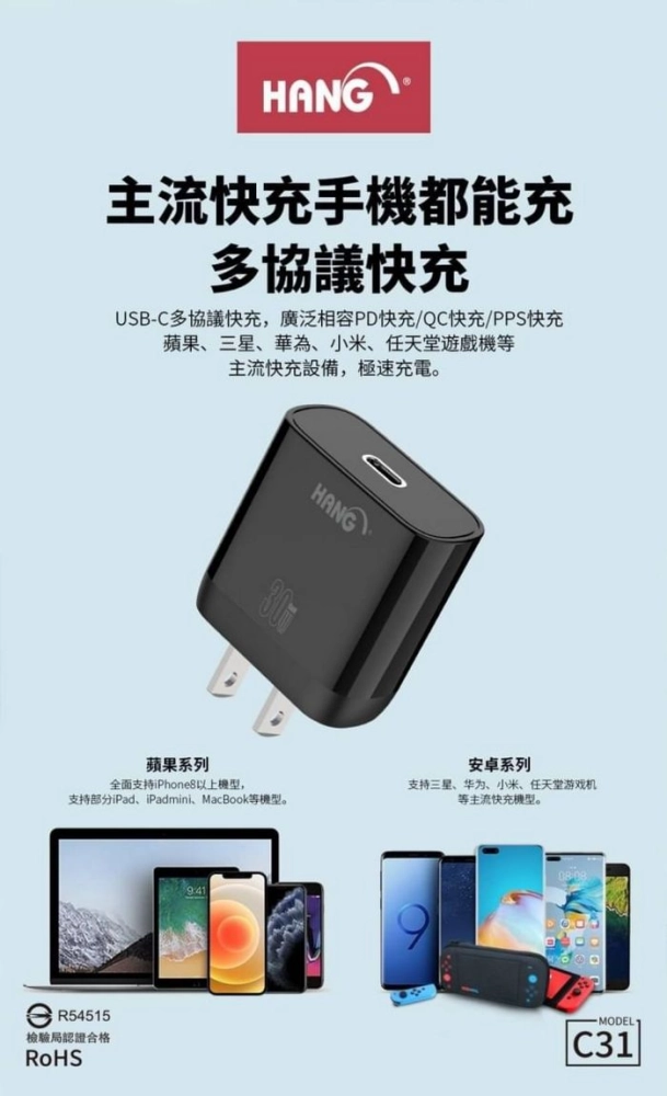 •  (單C口) C31 30W 氮化鎵 快速閃充電器(HANG)