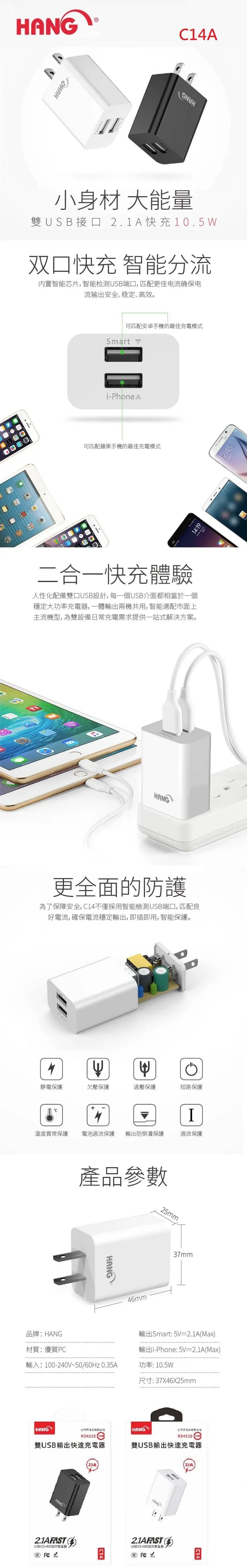 • 黑 HANG C14A 2.1A 雙USB輸出旅充頭