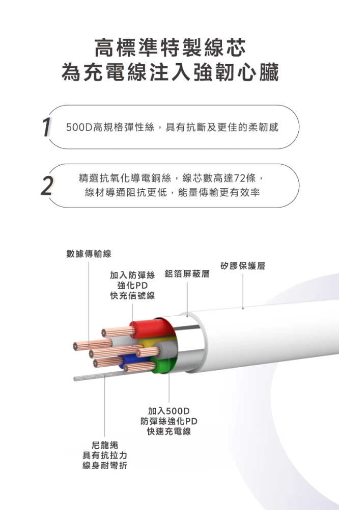 ・支援 PD/QC 協議,最高 100W 極速快充 ・搭載 E-mark IC,支援20V/5A 100W 最大功率傳輸 ・抗菌無毒矽膠&特製線芯,柔韌耐用 ・高品質 USB-C 連接器,高導電、耐彎折