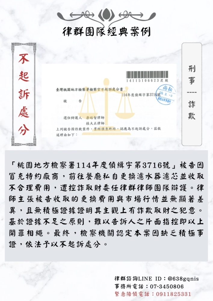 「桃園地方檢察署114年度偵緝字第3716號」被告因冒充特約廠商,前往餐廳私自更換濾水器濾芯並收取不合理費用,遭控詐取財委任律群律師團隊辯護。律師主張被告收取的更換費用與市場行情並無顯著差異,且無積極證據證明其主觀上有詐欺取財之犯意。基於證據不足之原則,難以告訴人之片面指控即以上開罪相繩。最終,檢察機關認定本案因缺乏積極事證,依法予以不起訴處分。