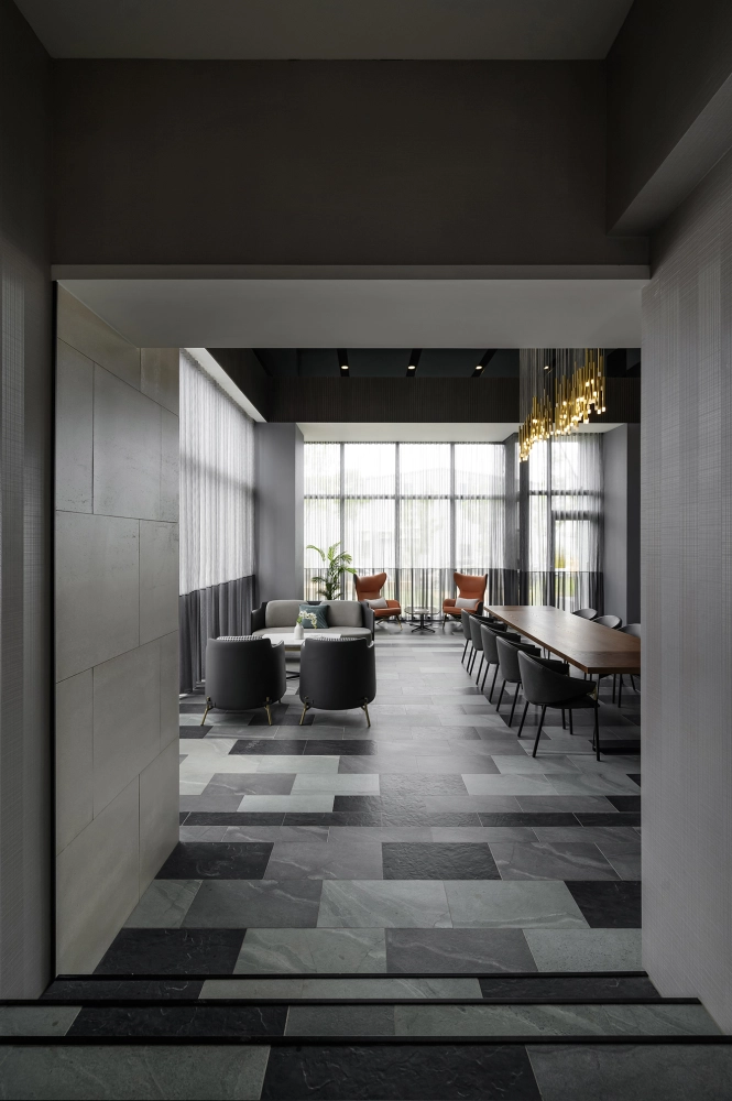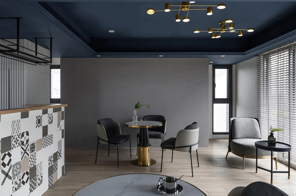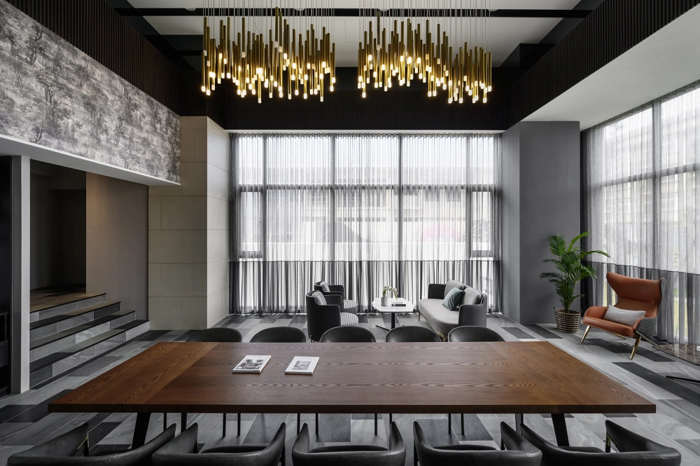 Inspired by the Four Arts—zither, Go, calligraphy, and painting—the design blends Eastern aesthetics with modern living. Each space reflects an art: the lobby channels the zither through vertical lines and light; the gym, through grid forms; the reading room evokes calligraphy with bookshelves; the lounge captures painting beneath a blue ceiling. Linear guidance unifies the design, with angled flooring, lighting, and mixed materials creating a refined Eastern rhythm. From construction to detail, the designer ensured a poetic and functional space where culture and daily life meet in harmony.