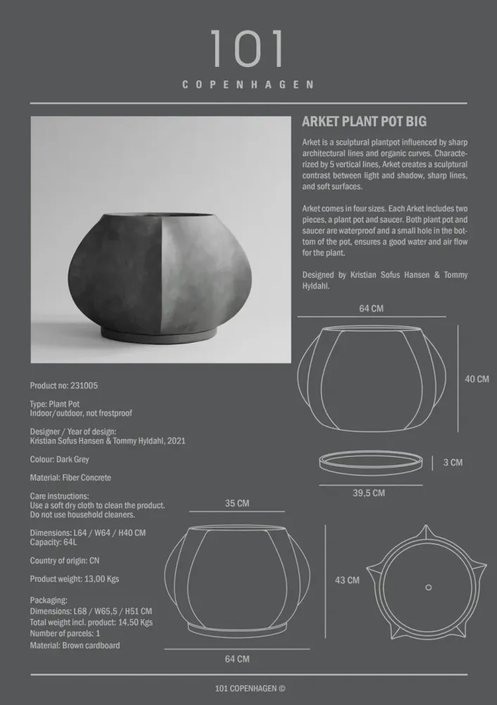 Arket 是一款受銳利建築線條和有機曲線啟發的雕塑性植物花盆。其特徵是五條垂直線條,營造出光影、銳利線條與柔和表面之間的雕塑對比。