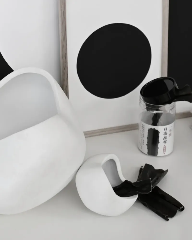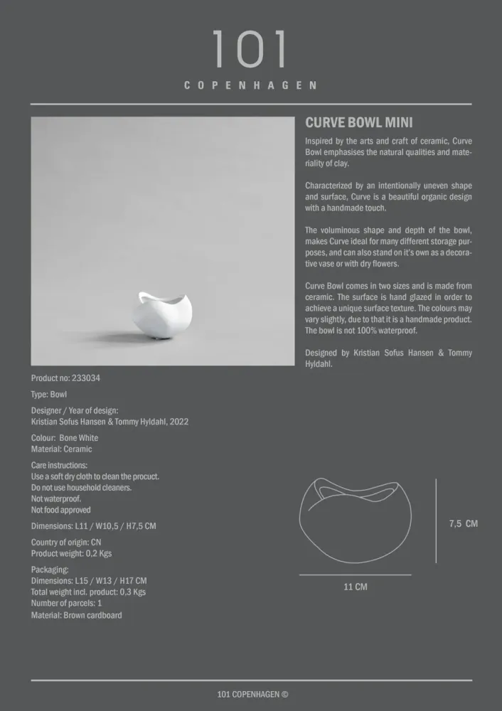 曲線碗以陶瓷工藝為靈感,強調陶土的自然質感與材質特性。碗的設計特徵是有意的不規則形狀與表面,展現了手工製作的獨特美感。豐滿的造型與深度適合多種儲存需求,也可作為單獨擺放的裝飾品或乾燥花器。