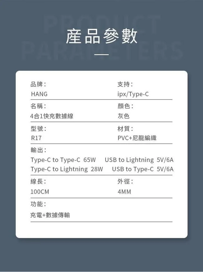 商品白-Hang-CL1-1米(C To Lighting)傳輸充電線