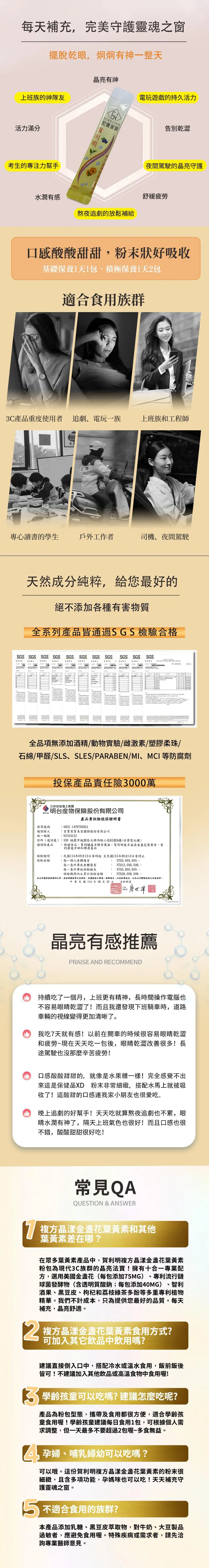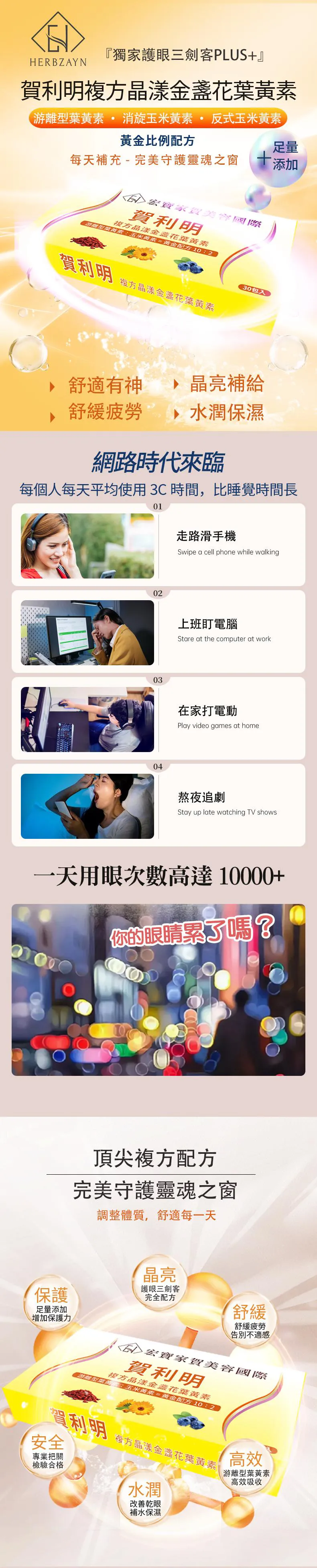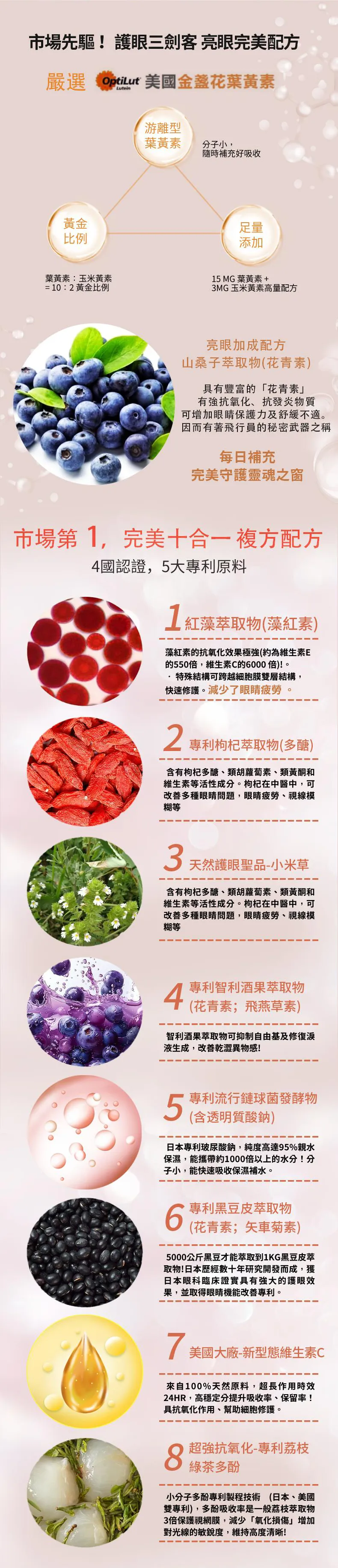 獨家護眼三劍客Plus+ 亮眼完美配方 游離型葉黃素X消旋玉米黃素X反式玉米黃素 ,黃金比例配方 每天補充,完美守護靈魂之窗 擺脫乾眼,炯炯有神一整天 舒緩有神、晶亮補給、舒緩疲勞、水潤保濕