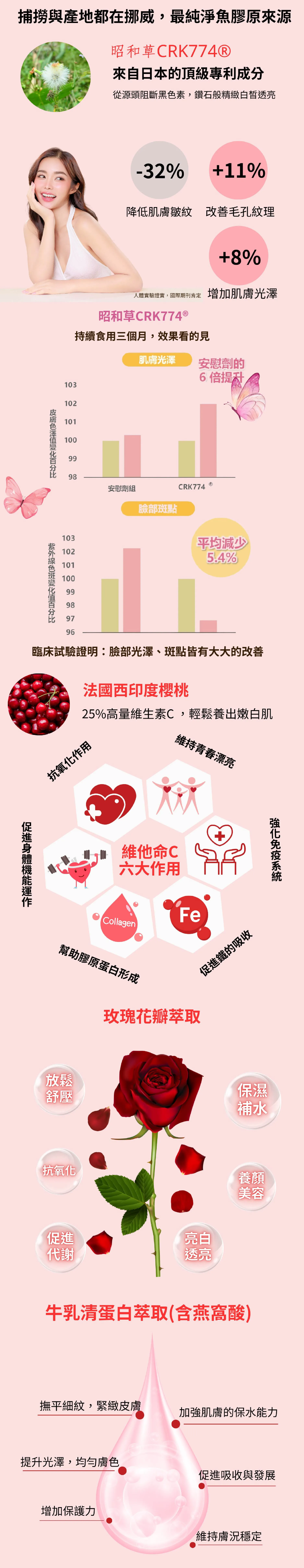 創新逆齡對策,打造白裡透紅亮澤肌 成為全場膠點 日本專利昭和草CRK774® 複方膠原蛋白 從源頭阻斷黑色素!還你精緻白皙透亮 由內而外 晶瑩透亮 散發光芒 水潤亮澤、白裡透紅、緊緻透亮、營養補給