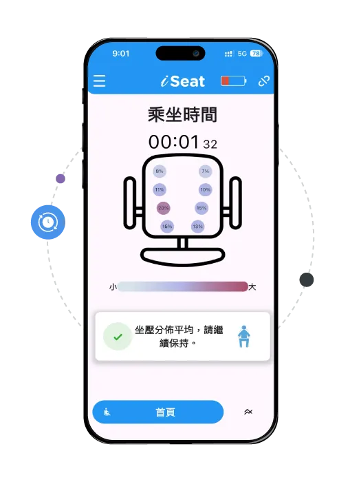iSeat App 將看不到的壓力與坐姿變化,轉化為可見的資訊,讓使用者與照護者都能更早掌握身體訊號,做出對應調整。