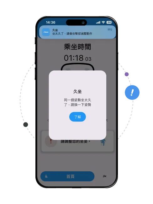 當壓力集中或乘坐時間過長,iSeat 會主動提醒,協助你即時調整姿勢。