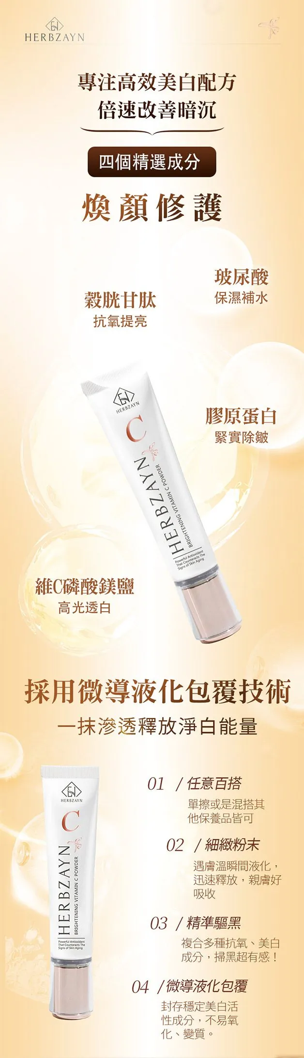 專門給皮膚吃的高滲透維他命C粉 一抹即化,讓肌膚散發透亮光采 均勻膚色、高光透白、保濕補水、緊實修護、抗氧提亮 產品不含酒精、環境賀爾蒙、西藥等有害物質,孕媽咪和敏感肌皆可以安心使用
